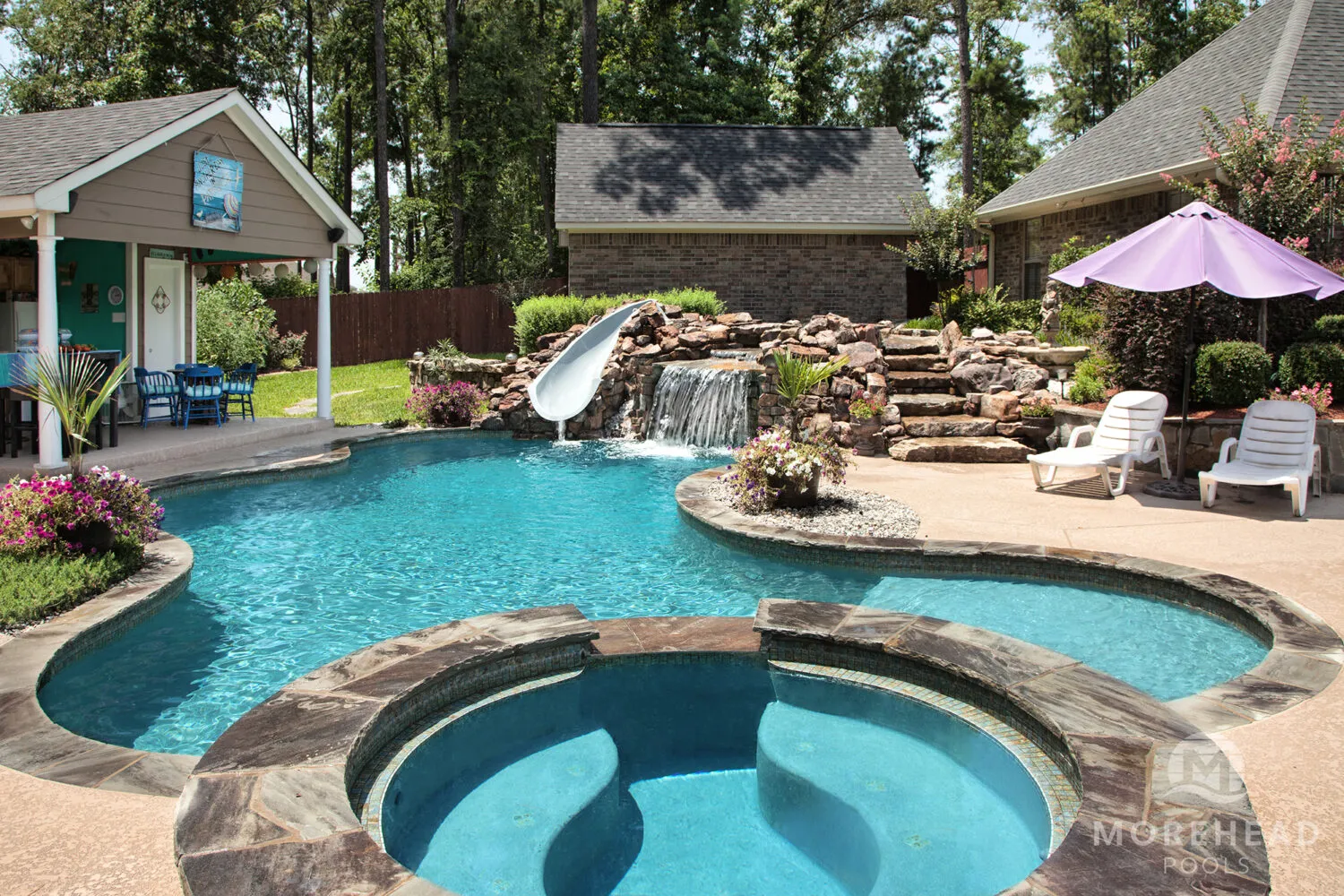 Water slides are another favorite addition, especially when paired with a waterfall-grotto combo. Our designers can customize the water slide to conform to the contours of the rock formations creating a naturally fun atmosphere.